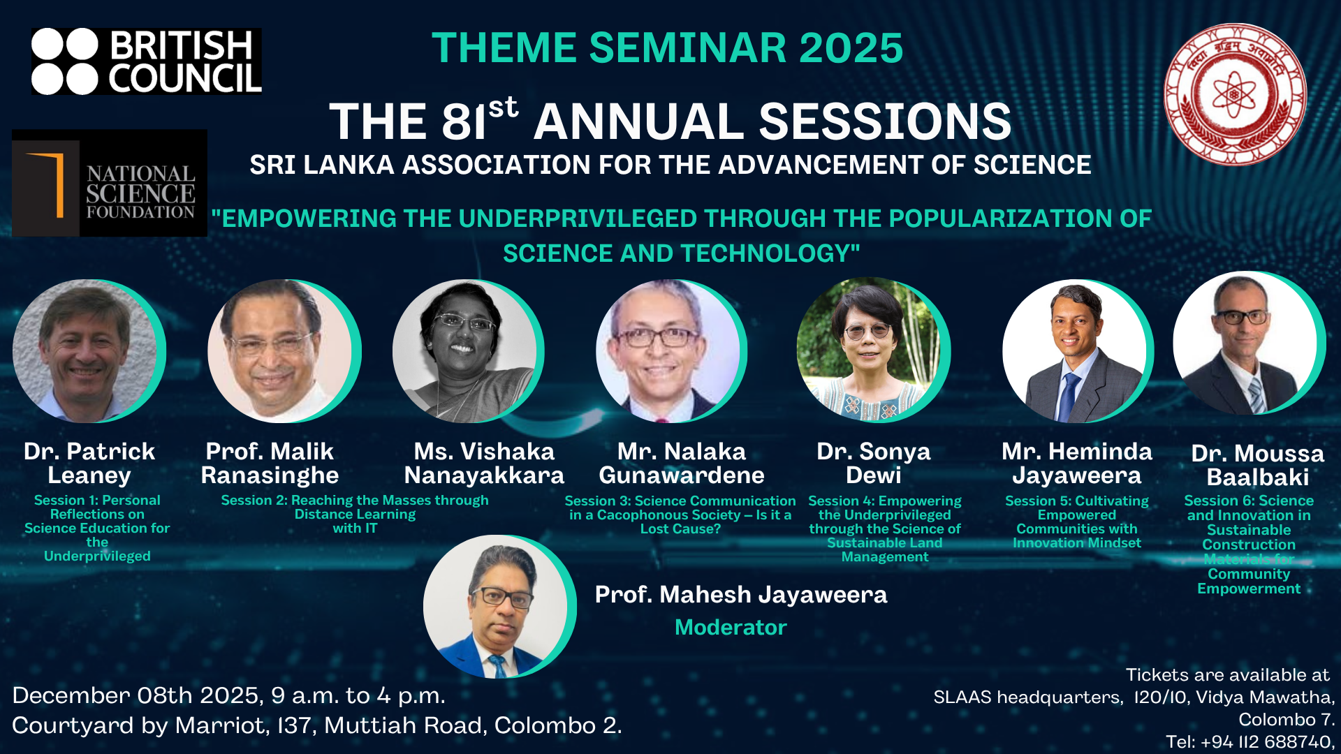 Prof. Udeni P. Nawagamuwa, Professor Udeni P. Nawagamuwa, Professor in Civil Engineering, University of Moratuwa, was inducted as the 84th General President of the Sri Lanka Association for the Advancement of Science (SLAAS) at a ceremony held on 07th January 2025 at the Gall Face Hotel, Colombo 02. Dr. Harini Amarasuriya, the Prime Minister of Sri Lanka, graced the occasion as the chief guest and Prof. Gomika Udugamasooriya, the President’s Senior Advisor on Science and Technology, was the guest of honour at this elegant occasion. Professor Udeni P. Nawagamuwa declared “Empowering the Underprivileged Through the Popularization of Science and Technology” as the theme for the year 2025.